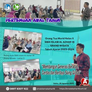 Pertemuan Awal Tahun Wali Murid Kelas X SMA ISLAM AL AZHAR 18 GRANDWISATA di Aula Lantai 3 Kampus Al Azhar Grandwisata telah terlaksana pada hari Sabtu tanggal 26 Agustus 2023.